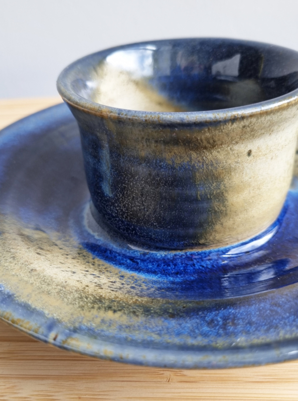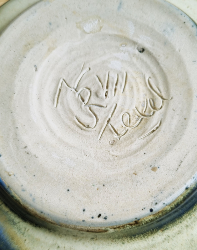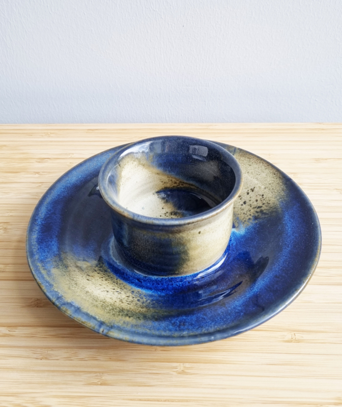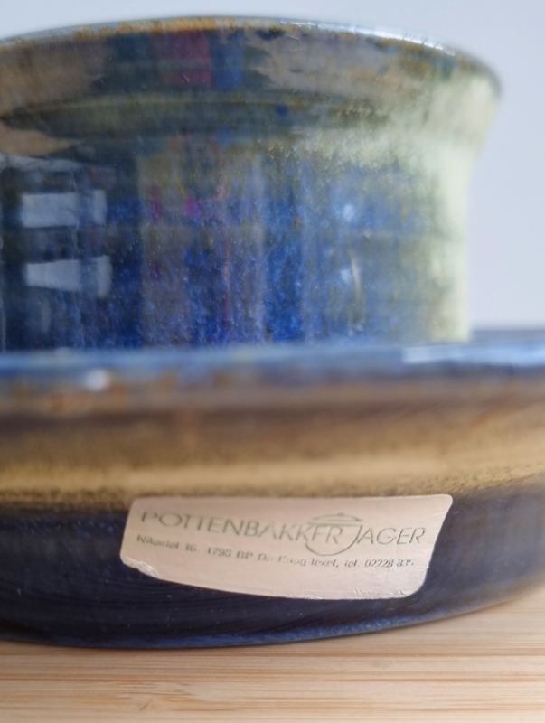 OverzichtLeuke serveerschaal handgemaakt op Texel van aardewerk. Blauw en beige glazuur. Afmetingen: 20 cm doorsnede, 7 cm hoog.