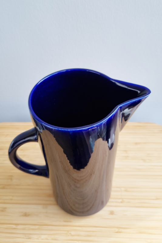 OverzichtVintage karaf van blauw porselein. Afmetingen: 22 cm hoog, 10 cm doorsnede.