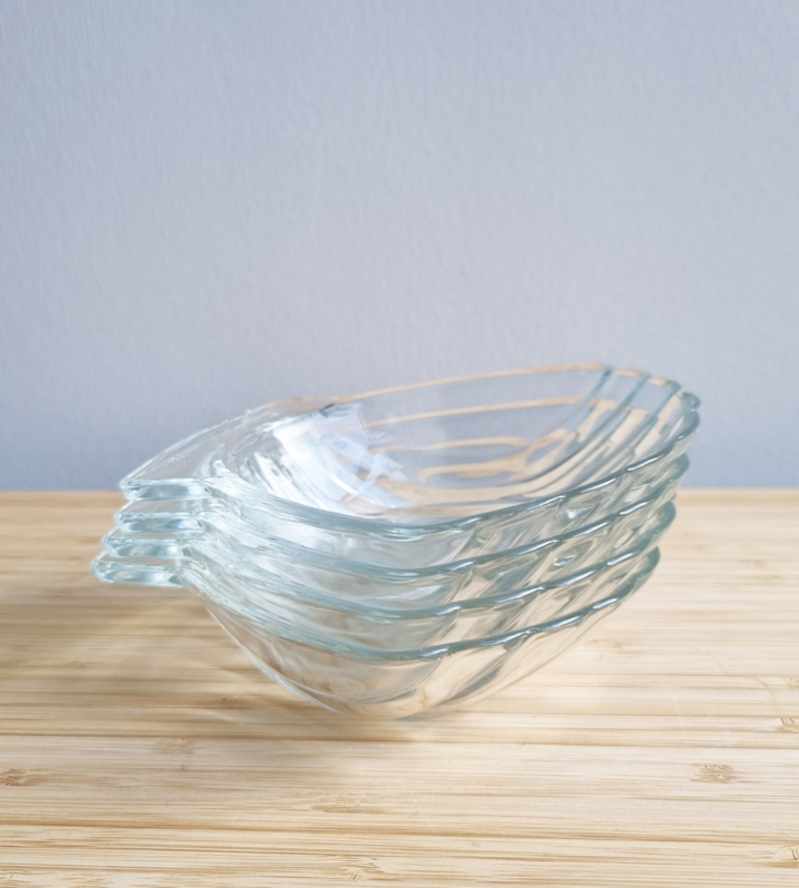 OverzichtSet van vier schaaltjes in de vorm van Sint jacobsschelp. Helder glas van Sovirel France. Afmetingen: 13 cm lang, 13 cm breed, 3 cm diep.