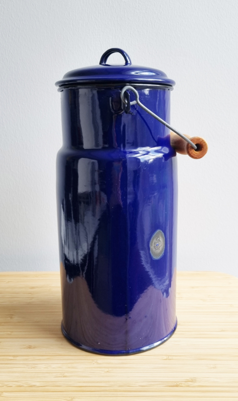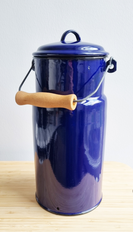 OverzichtVintage melkbus van emaille. Kobaltblauw. Er zit een klein gaatje in de zijkant van de bus, en daarom is hij niet geschikt meer voor het bewaren van vloeistof. Afmetingen: 30 cm hoog, 14 cm doorsnede.
