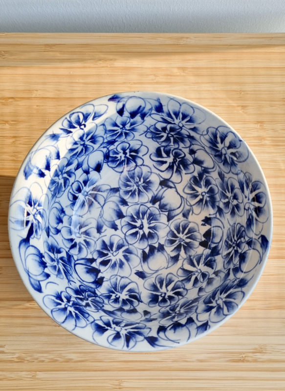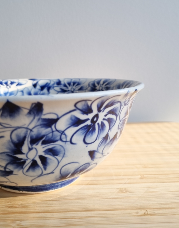OverzichtPorseleinen kom uit Tokyo Japan. Handbeschilderd in de kleuren blauw en wit. Heeft een klassiek Japans bloemenpatroon. Afmetingen: 7 cm hoog, 16,5 cm doorsnede.