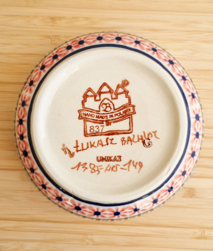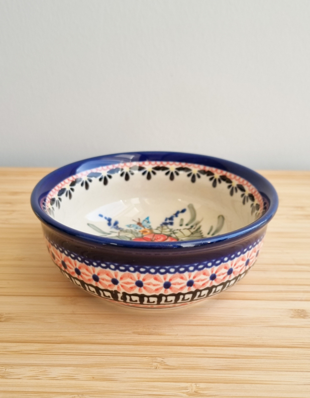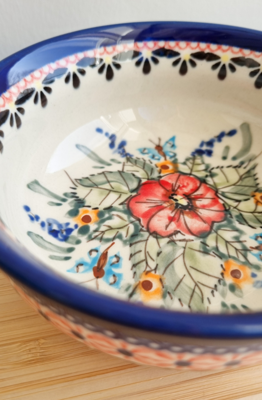 OverzichtDit is een handgemaakt Boleslawiec ( Bunzlau) schaaltje uit Polen. Elk stuk is met de hand bestempeld, wat het uniek maakt. Het servies is oersterk en geschikt voor dagelijks gebruik. Kan in de vaatwasser, oven en magnetron. Afmetingen: 12,5 cm doorsnede, 4,5 cm hoog.
