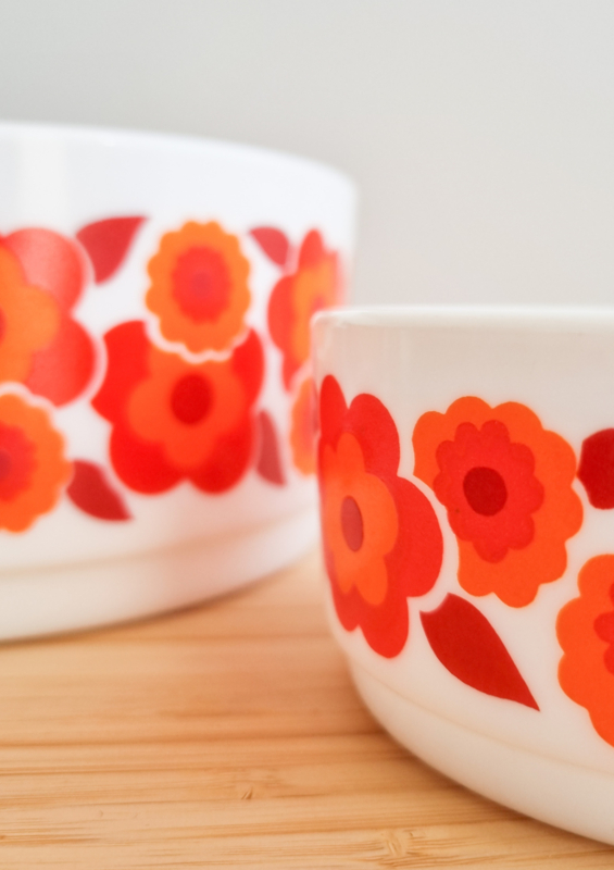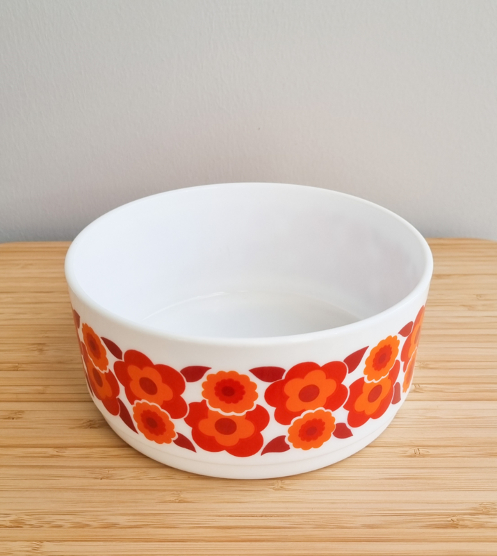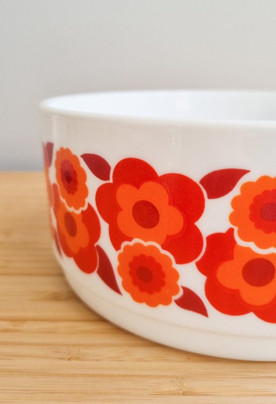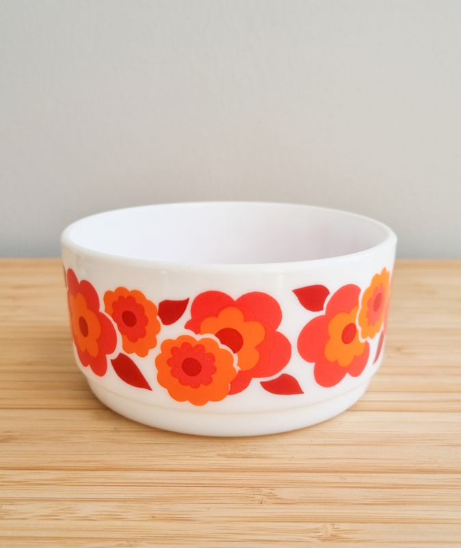 OverzichtArcopal Lotus serveerschalen, bekend om hun iconische oranje bloemenprint uit de jaren 60 en 70. Gemaakt van melkglas (opaalglas). Afmetingen van de grote schaal: 17 cm doorsnede, 7,5 cm hoog. Kleine schaal: 10 cm doorsnede, 5 cm hoog.