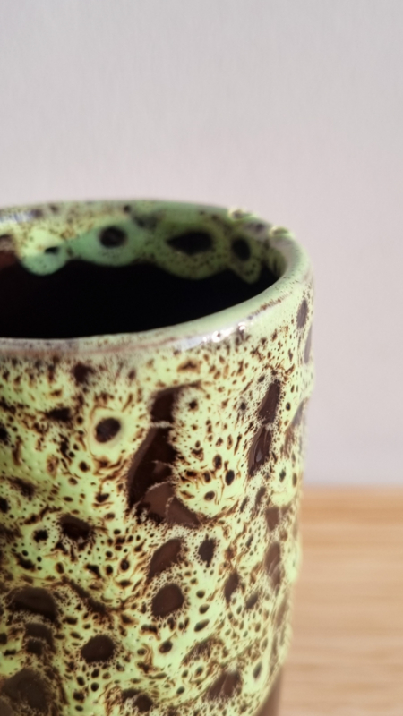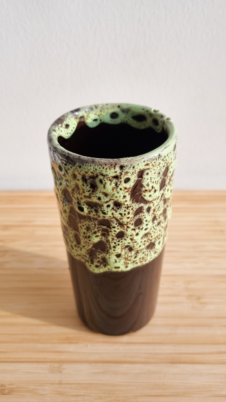 OverzichtMid - Century modern "Fat Lava" vaasje met een kenmerkend dik glazuur. Typisch uitgevoerd in groen en bruin. Afmetingen: 14 cm hoog, 6 cm doorsnede.